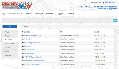 I am happy to announce the deployment today of a new Data Depot interface that includes the ability to create shared spaces for Projects. This new interface, shown below, still has “My Data” and “Shared with Me”, access to your “Box.com” account, and access to the Public NEES data under “Published”. However, we have added an area for “My Projects” where you can create a project and add collaborators, all of whom have access to the files and folders uploaded into the Project. You do not need to be the PI to create the project, so EF facilities who would like to create projects for their users may do so. You may change the name of the Project, so if the team wants to change the name at some point, they may do so.