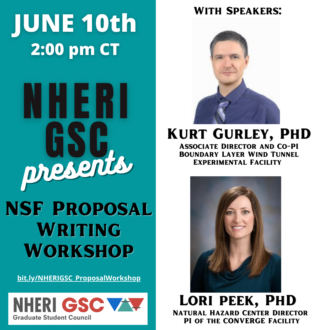 The NHERI GSC will be hosting a virtual NSF Proposal Writing Workshop on June 10th at 2:00 pm Central Time. The presentation will introduce to NSF Proposal Writing along with advice and tips for writing successful NSF proposals from speakers Dr. Kurt Gurley and Dr. Lori Peek. To register, please visit bit.ly/NHERIGSC_ProposalWorkshop<https://nam11.safelinks.protection.outlook.com/?url=https%3A%2F%2Futsa.az1.qualtrics.com%2Fjfe%2Fform%2FSV_dbB20BPjYwqNGbY&data=05%7C01%7Ctodorov%40chapman.edu%7C4c41386c022f4dbc6ffb08da3b4aea9a%7C809929af2d2545bf9837089eb9cfbd01%7C1%7C0%7C637887490220150802%7CUnknown%7CTWFpbGZsb3d8eyJWIjoiMC4wLjAwMDAiLCJQIjoiV2luMzIiLCJBTiI6Ik1haWwiLCJXVCI6Mn0%3D%7C3000%7C%7C%7C&sdata=pTHNl%2FUndjttWUv2gp4Gsz4GF0MAgn7ecMQkPYMGOyw%3D&reserved=0>