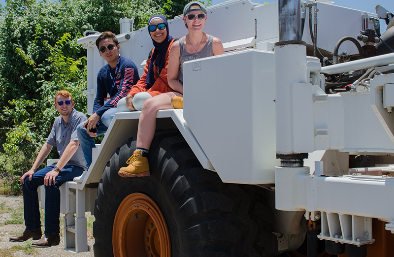 Above: NHERI REU students sitting on the Liquidator mobile shaker at the
